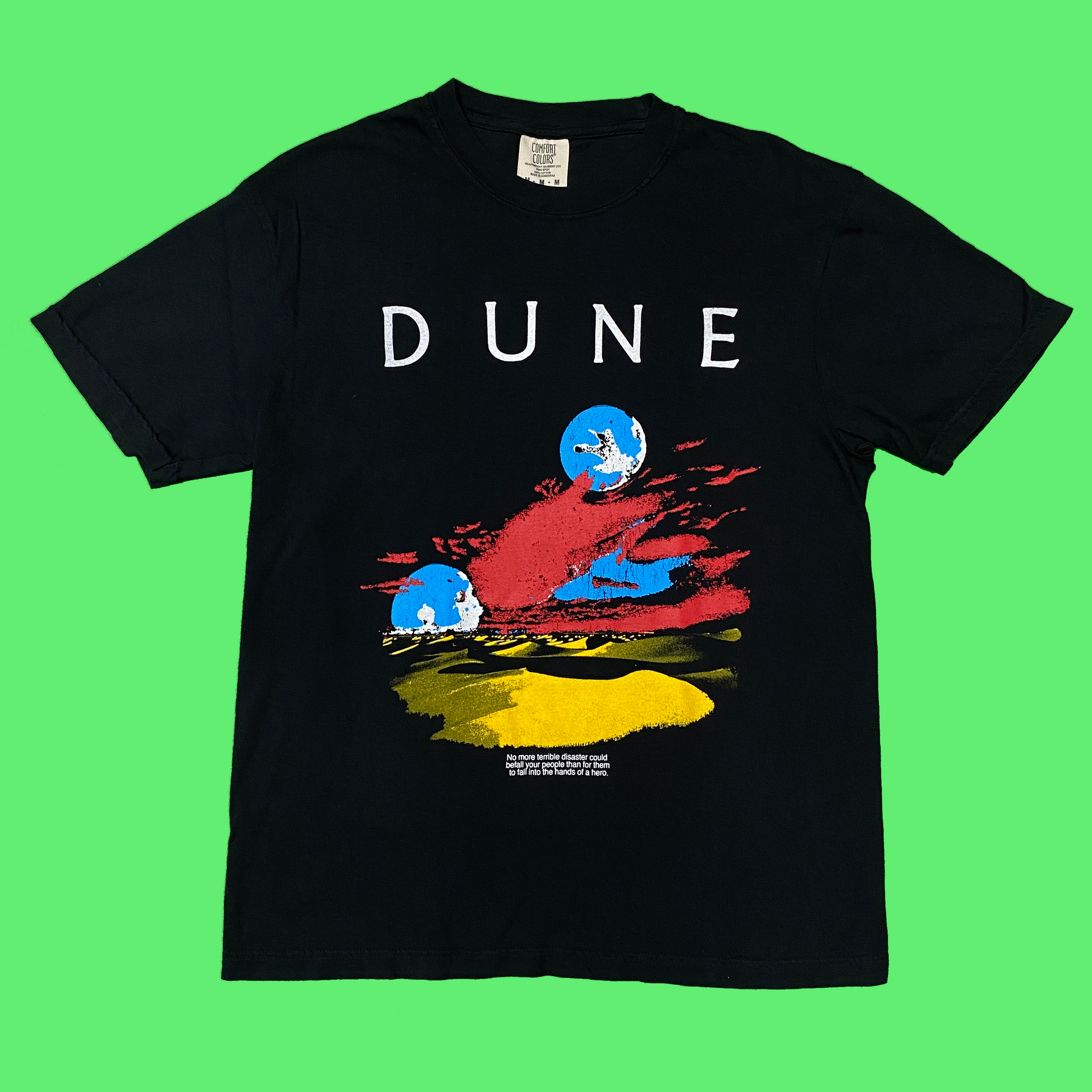 Long live the fighters! this is an ode to one of the greatest sci-fi novels ever written... DUNE! This design is based on the two moons variant of the 1984 film poster, featuring our favorite quote from the book (read the fine print) conveying one of the central themes. 4 color design screen printed on black comfort colors blanks.