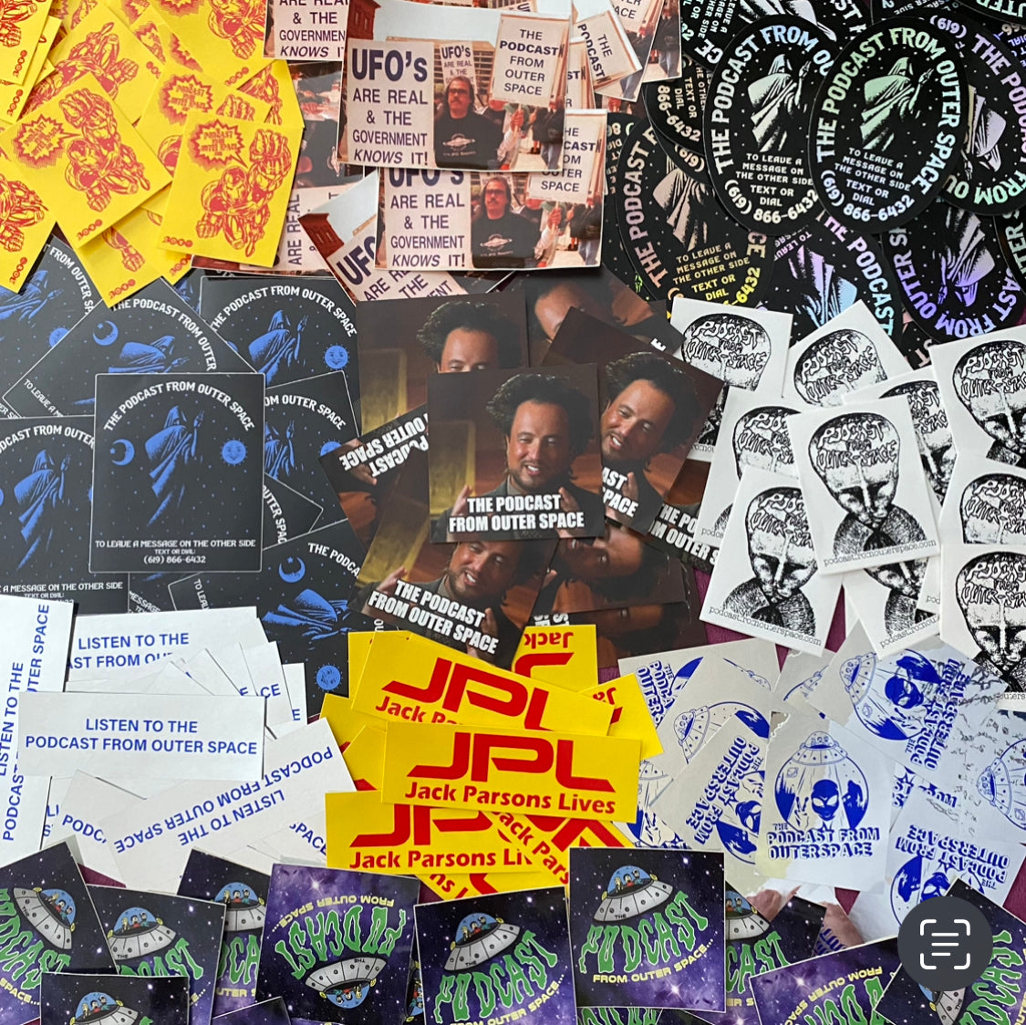 An assortment of 10 stickers (types depend on whats in stock). If you'd like something specific just drop us a line at podcastfromouterspace@gmail.com