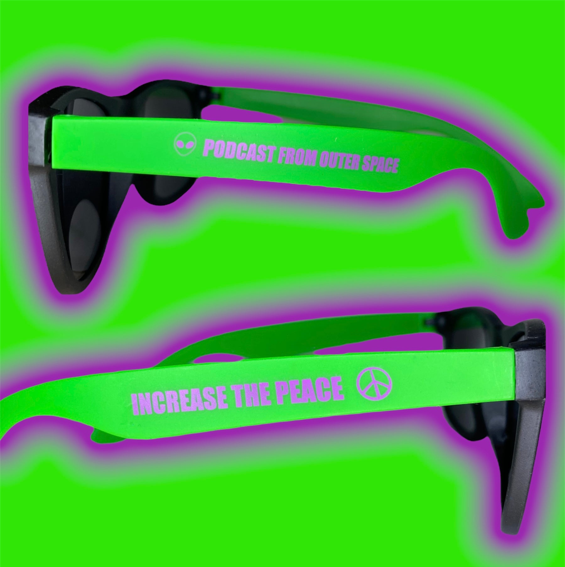 Podcast from Outer Space printed on one side and Increase the Peace on the other. Put your stunna shades on & gas, brake, dip.